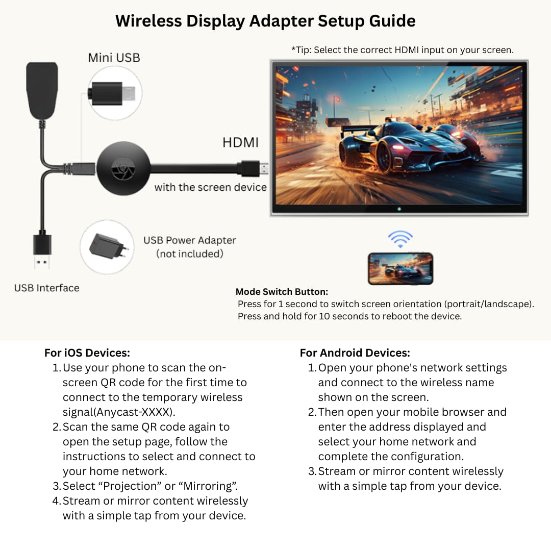 - 1️⃣ 【Smooth 1080P HD Wireless Streaming】 Experience seamless 1080P screen mirroring with this advanced wireless HDMI display adapter. Perfect for casting videos, games, or presentations from your phone, tablet, or laptop to your TV or projector – no cables, no delays.